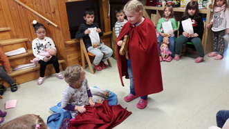 mit dem Bettler teilte. So taten es die Kinder später auch beim Frühstück in den Gruppenräumen, wo die Tische schon wunderschön gedeckt
